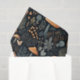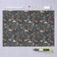 This whimsical design features terracotta toadstool mushrooms on a dark navy blue background with forest berries and fauna.
