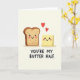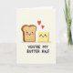 This card shows two friendly food characters side by side on a soft, creamy beige background, sharing the kind of close, comfortable energy that feels like a sweet inside joke ❤️. On the left is a slice of golden-brown toast with a darker crust, a lighter center, wide sparkling eyes, rosy cheeks, and an open smile turned slightly toward its companion. On the right sits a sunny yellow pat of butter with softly wavy edges, matching the toast’s bright expression with blushing cheeks and a grin that suggests easy affection. A pair of red hearts floats above them, reinforcing the tender connection between the two characters without needing anything else in the scene 🌼. Gentle shadows beneath each figure add a little depth, as if they’re resting on an invisible tabletop. Centered below the characters, the phrase “YOU’RE MY BUTTER HALF” appears in thick, simple lettering in a dark tone that stands out clearly against the pale background. The toast and butter are placed centrally with even spacing, and two small red hearts hover above their smiling faces.