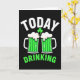 This card features a deep black background with the word “TODAY” set across the top in bright white letters, giving the design a crisp, high-contrast start. Just below that, a small green shamrock sits centered like a little cue between friends before the toast ☘️. Two stylized beer mugs take up the middle, angled toward each other as if clinking, which adds a friendly, close-together feel. The beer inside each mug is a rich shamrock green with thick white foam piled on top, suggesting fresh, fizzy pours 💚. Subtle vertical stripes on the glass add extra detail without crowding the scene. Near the bottom, the word “DRINKING” appears in matching green, aligned beneath the mugs to balance the layout. The mugs have squared handles and glossy highlights, with the white foam forming rounded caps against the black backdrop.