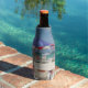 Custom bottle cooler wrapped in an image reminiscent of sitting on a chair, at the beach, under a huge umbrella... watching the waves, with your toes in the sand.
