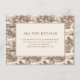 This is a vintage style image featuring an elegant wedding invitation detail card. The background showcases charming, sepia-toned illustrations of quaint cottages and lush landscapes, creating a nostalgic and romantic atmosphere. At the center, a clean white rectangle provides space for essential information about accommodations and additional details, inviting guests to visit a wedding website for more insights. It exudes warmth and sophistication, perfect for couples aiming for a classic yet personalized wedding theme.