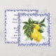 This charming customizable invitation features a lovely European-style design with luscious ripe lemons surrounded by a toile filigree border in royal navy blue. A vibrant bunch of lemons sits nestled in a branch of generous green leaves, creating an elegant and refreshing vibe. Personalize the back for any party or gathering—perfect for lemon-themed celebrations like bridal showers, birthdays, or garden parties. A fresh and delightful touch for your special event!