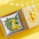 A bunch of bright, ripe lemons on a branch encircled with generous green leaves. A border of royal navy blue toile filagree borders the design.