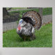 A male turkey displays his dramatic plumage and very interesting appearance in a pen at a children's zoo.