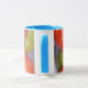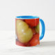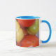 A white mug with blue rim and handle, decorated with a photo of ripening tomatoes