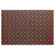 Red and black fabric featuring juicy red tomatoes, tomato slices, and little green leaves.