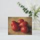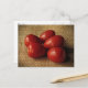 This delicious postcard features a still life photograph of 5 ripe, juicy, red tomatoes, bursting with great taste. They are arranged on a golden brown straw mat.