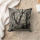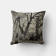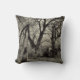 Crow perched on a gravestone in a old overgrown cemetery on a Halloween style pillow that would fit in a Gothic themed room or house..