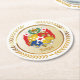 The coat of arms of Tonga is set in the middle of a faux gold circle which is in between 2 laurel branches which are also faux gold.