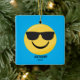 Join the emoji crazy! Personalize this ornament with your name or give as a gift. It has a bright blue background with a smiling face and black sunglasses emoji. Check out the many other emoji ornaments we offer in our store.