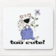 A white with brown stripes kitty cat holding a lilac flower and text that reads "Too Cute!" on cat T-shirts, mugs, buttons, bags, and more.
