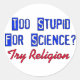It's time to fight back against the religious fanatics who want to deny Science in favor of superstition. In blue letters "Too stupid for science?" answered in red letters "Try Religion."