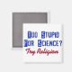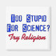 It's time to fight back against the religious fanatics who want to deny Science in favor of superstition. In blue letters "Too stupid for science?" answered in red letters "Try Religion."