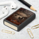 A classic dark tooled leather background frames a tranquil lake where a lone man casts his line from a simple boat. The rustic detail captures the peaceful solitude of fishing, blending craftsmanship with nature. Ideal for outdoorsmen, collectors, or those who admire timeless outdoor artistry.