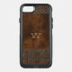 Rustic western inspired Otterbox brand iPhone 7 Plus case done in graphics of a distressed brown tooled leather. A tan single letter monogram is ready to personalize. Chose the device style and type you want before ordering.