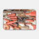 A collection of old antique red handled tools on a table at a flea market.
