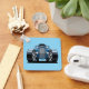 Hyper-stylized front-view toon hotrod with massive wheels, electric-blue shine, bold grille and powerful low-angle stance for a dynamic monster cartoon car look.