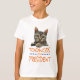 "toonces for president" in orange writing with a picture of a cat. There are blue stars on it.