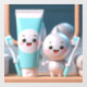This adorable image features a tube of toothpaste and a little silver character, both with big, happy eyes and rosy cheeks. They stand side-by-side, each holding a toothbrush, ready to start their day with a smile. The bright blue and white color scheme, along with the playful characters, creates a cheerful and inviting atmosphere, perfect for promoting good oral hygiene.