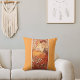 A throw pillow featuring the fashion illustration Topaz by Alphonse Mucha (1860-1939) is an example of the Art Nouveau movement. The painting depicts a young female figure, with decorative patterned backgrounds in orange hues and touches of nature. The female figure gazes directly at the viewer with a relaxed, elegant expression.