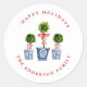 Elegant & personalized Happy Holiday Label/seal featuring watercolor topiaries in blue and white pot.
