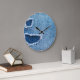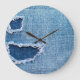 Torn denim fabric texture, blue hues. large clock
