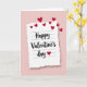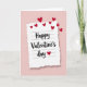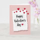 This greeting card shows a torn-edged piece of white lined paper centered on a soft pastel pink background. The paper has faint blue lines and a gentle shadow, so it looks like it’s resting on the card. Across the paper, the text reads “Happy Valentine’s day” in smooth black cursive-style lettering, placed right in the middle. A small red heart sits just under the word “day,” like a sweet little sign-off ❤️. Around the top and along the right side, several deep red hearts float upward and outward, as if they’re drifting through the air. The mix of the calm pink backdrop, the simple note, and the scattered hearts makes the whole scene feel warm and sincere. It’s a meaningful card to give because it feels like sharing a real message you’d write to someone you care about 🥰.