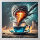 A photo of a cup of coffee with a tornado coming out of it. The coffee cup is white with a black handle, and it is sitting on a wooden table. The tornado is coming out of the top of the coffee cup, and it is made up of a swirling mass of coffee.