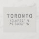 Toronto longitude and latitude coordinates in distressed fonts give this postcard a modern urban look