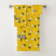 Cartoon illustration of tortilla sandwich wrap. Junk food outline icons yellow pattern background. Custom text on each towel.