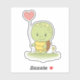 Cute cartoon tortoise holding a pink love heart balloon. He has a green head and legs, a yellow body, a brown shell and an adorable face. Next to him is a small happy yellow flower.