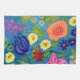 Multi-colored tossed flowers on a blue background add a whimsical, colorful detail to your kitchen. Painted in gouache and acrylic.