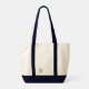 Love the durable cream colored canvas and navy blue contrasted handles. Perfect for carrying my laptop and papers.