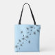 This cute stylish tote bag is shown in a nature print of dandelions and tote has black straps.