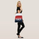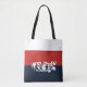 This cute stylish medium size tote bag is shown in red, white and blue with thin black stripe and handles in a striped color block with the special text Vegas.