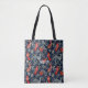 Tote Bag in a Folk Art design with animals and birds, plus a faded faux gold diamond look. The color of the bag is dark blue, red and white.