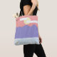 This tote bag is designed with a depiction of blue water and mountains under an orange sunset sky, and it's ready for your possessions.