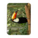 In a lush tropical rainforest, a vibrant toucan perches gracefully on a moss-covered tree branch, its striking, oversized beak contrasting brilliantly against the verdant foliage. The bird's iridescent plumage and intense gaze make for a captivating image, showcasing the beauty and exotic allure.