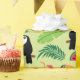 Colorful summer seamless pattern with funny toucans, juicy watermelons, pineapples, tropical flowers and delicious young coconuts.