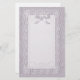 Sweet stationery features pretty damask background with lace edged overlay and pretty bow accent in pastel lavender tones.