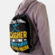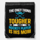 Hockey theme drawstring bag for the hockey mom with hockey pucks and sticks with text of white, yellow and blue that reads The Only Thing Tougher Than a Hockey Player is His Mom!