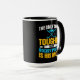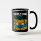 Hockey theme mug for the hockey mom with hockey pucks and sticks with text of white, yellow and blue that reads The Only Thing Tougher Than a Hockey Player is His Mom!