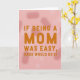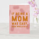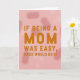 This Mother's Day card features a humorous quote in large, uppercase letters that fills most of the front, setting a friendly, affectionate tone ❤️. The main line reads, “IF BEING A MOM WAS EASY, DADS WOULD DO IT,” with “MOM” enlarged to stand out like the heart of the message. The lettering sits centered and stacked, creating a steady rhythm that feels confident without being harsh. The text is colored a warm orange-brown that looks cozy against the soft background, like a gentle wink between close family members. Behind it, a muted rose-pink field is softened by long, blurry light shapes that drift like out-of-focus petals 🌼. The overall look balances cheeky humor with a tender, caring mood, as if the words are giving Mom a knowing nod. The quote is arranged in the middle of the card on a rose-pink backdrop with hazy, elongated bokeh-like blurs fading across the surface.