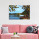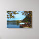 Canvas landscape print of traditional colorful tourist boats in Lake Bled under a chestnut tree in fall colors in an autumn landscape in Slovenia.