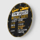 This humorous wall clock outlines the varying hourly rates for a tow truck driver based on the customer's behavior. Against a black background with a golden-yellow rim, it features a yellow car being towed by a yellow tow truck. The chart humorously lists increasing rates for different scenarios: "$150/HR MINIMUM", "$175/HR IF YOU WATCH", "$200/HR IF YOU HELP", "$250/HR IF YOU WORKED ON IT FIRST", and "$350/HR IF YOU TELL ME HOW TO DO MY JOB." It's a witty piece perfect for a tow truck driver's garage or office.