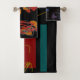 fabulous designs on towels and face cloth... dramatic and bold. sophisticated and elegant... black, red, turquoise, orange, purple, yellow and blue.