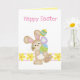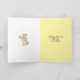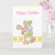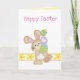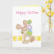 This brown rabbit is carefully caring a tower of colorful Easter eggs. As the rabbit slowly moves he notices a little bee buzzing around. Th background border is made up of yellow daisies. There's a text box on the inside for you to add your own message.