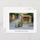Postcard of a typical French townscape with a gourmet store front and cobblestone streets in the traditional town Beynac-et-Cazenac along Dordogne river in Perigord region, France with a white border and the text: 'Dordogne'.