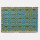 A vibrant pattern features repeated square motifs in green, yellow, and blue hues, creating a kaleidoscopic effect. The design has a symmetrical layout, reminiscent of a woven or tapestry-like appearance.