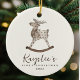 Toy Reindeer Baby's First Christmas Ceramic Ornament — The precious personalized xmas ornament template features an adorable watercolor toy reindeer rocking horse. The text boxes allow for easy customization of any baby's name in a handwritten calligraphy script font, and birth year in a simple, minimalist sans serif. Both sides of this personalizable, gender neutral keepsake tree decoration are identical.